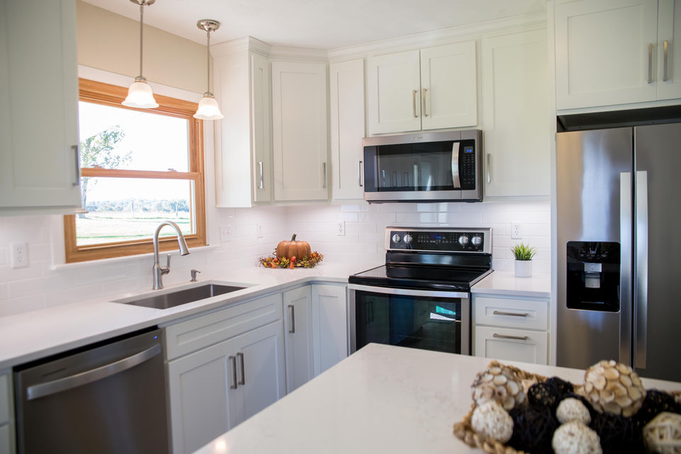 Wall & Base Cabinets: Pure WhiteIsland: White Maple; Dark Slate StainCountertops: Quartz Montauk Hanstone